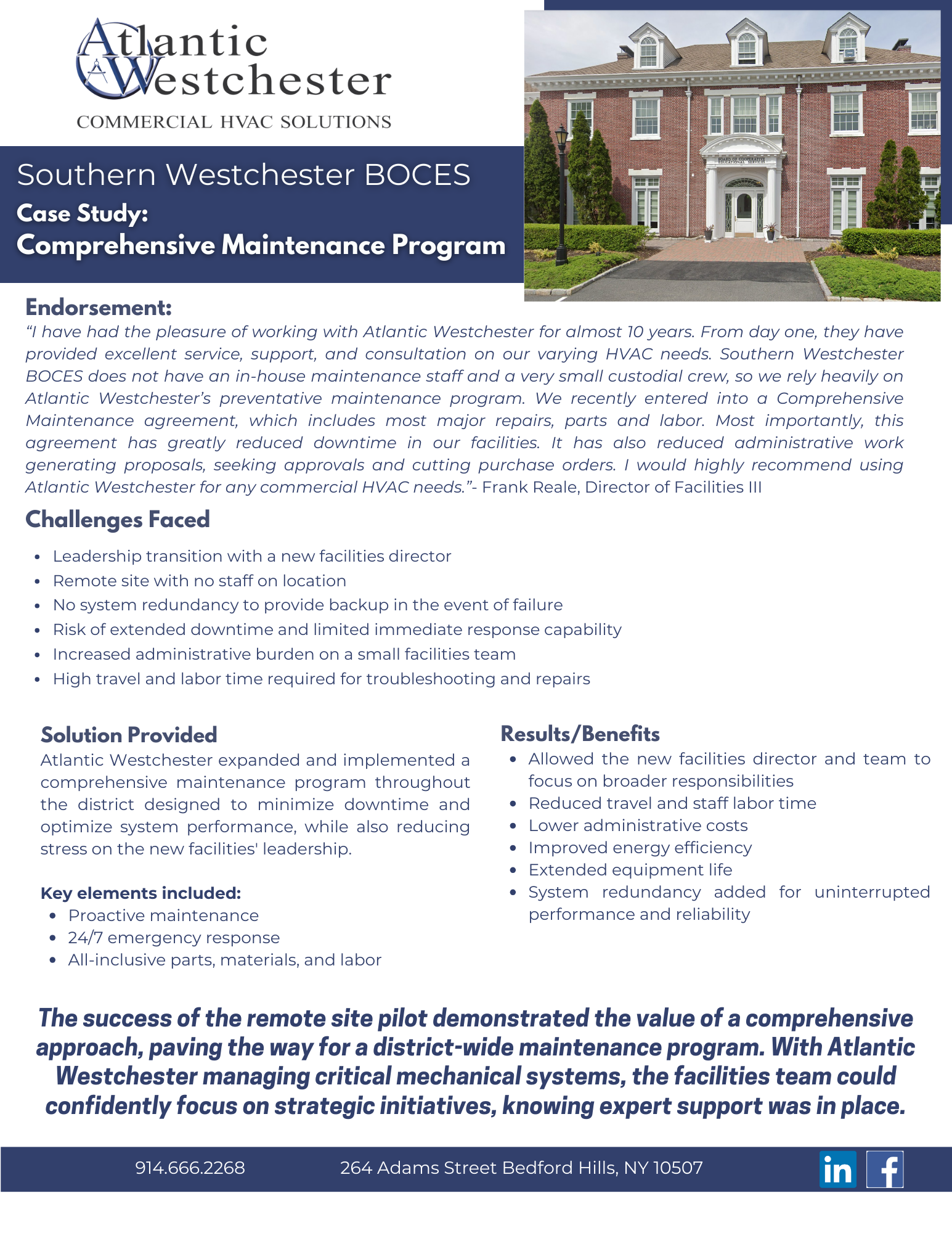 Atlantic Westchester expanded and implemented a comprehensive maintenance program throughout the district designed to minimize downtime and optimize system performance, while also reducing stress on the new facilities’ leadership.